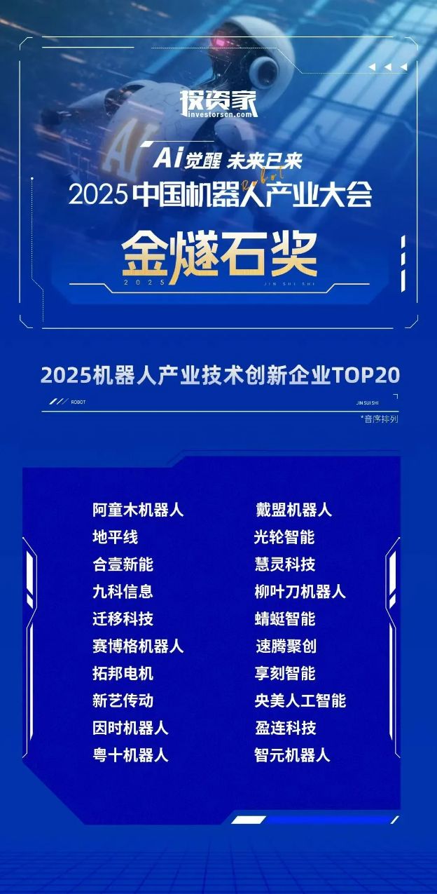 在“AI觉醒·未来已来”投资家网2025中国机器人产业大会暨“金燧石奖”颁奖盛典上,合壹新能 荣获“2025机器人产业技术创新企业TOP20”及“2025机器人产业最具投资价值企业TOP60”两项殊荣。
