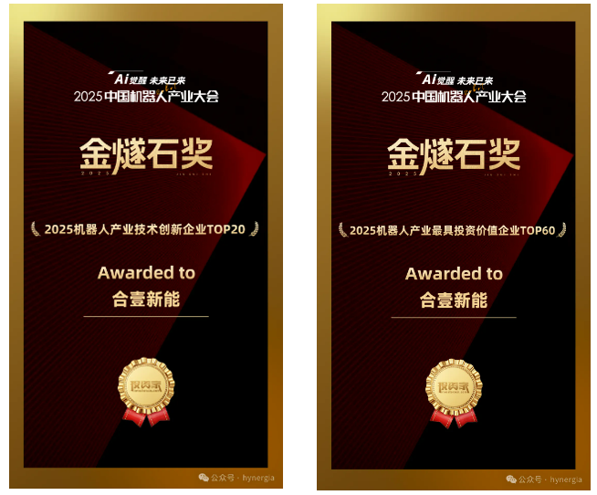 在“AI觉醒·未来已来”投资家网2025中国机器人产业大会暨“金燧石奖”颁奖盛典上,合壹新能 荣获“2025机器人产业技术创新企业TOP20”及“2025机器人产业最具投资价值企业TOP60”两项殊荣。